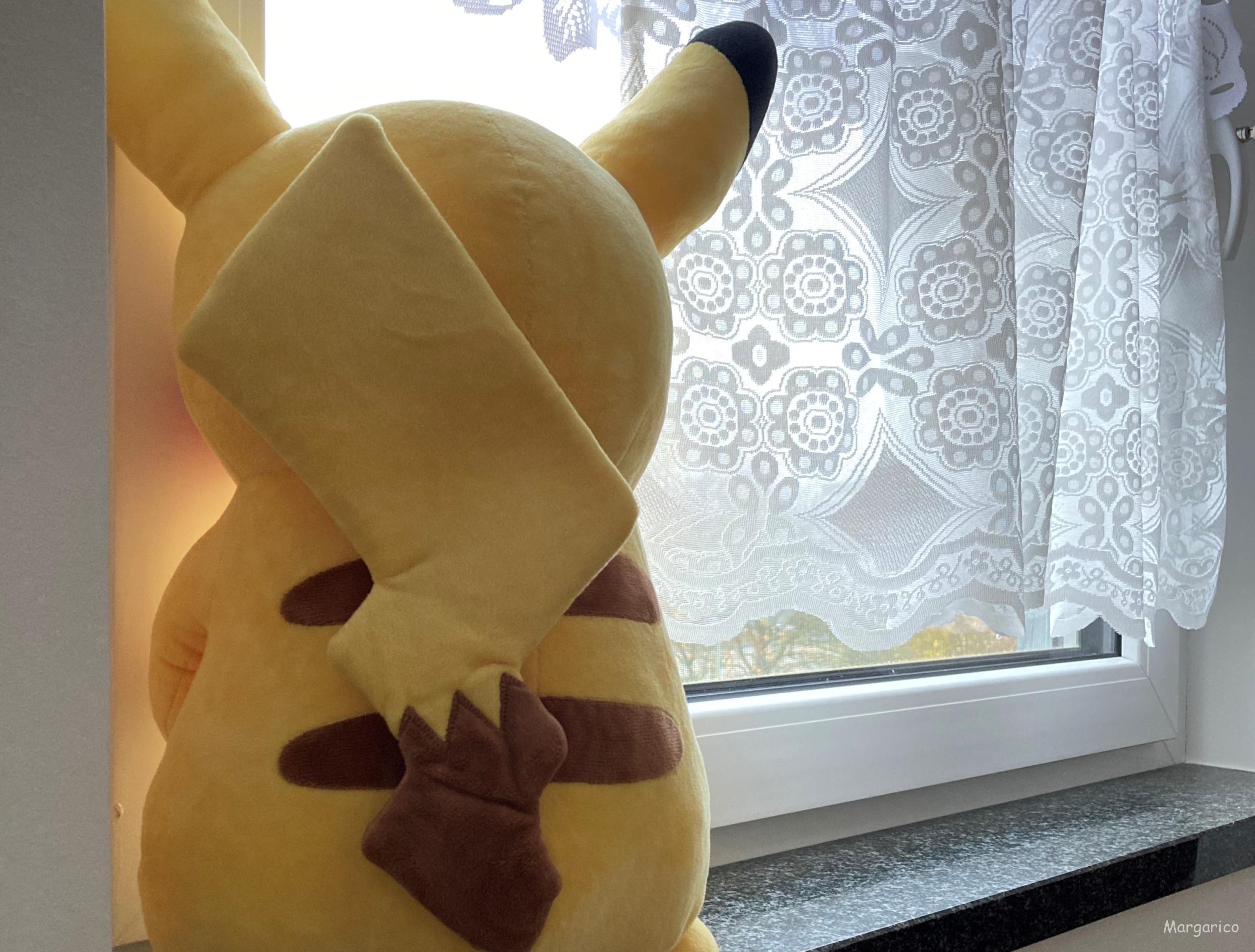 どんより曇り雨の外を見て黄昏ているピカチュウ ⇩