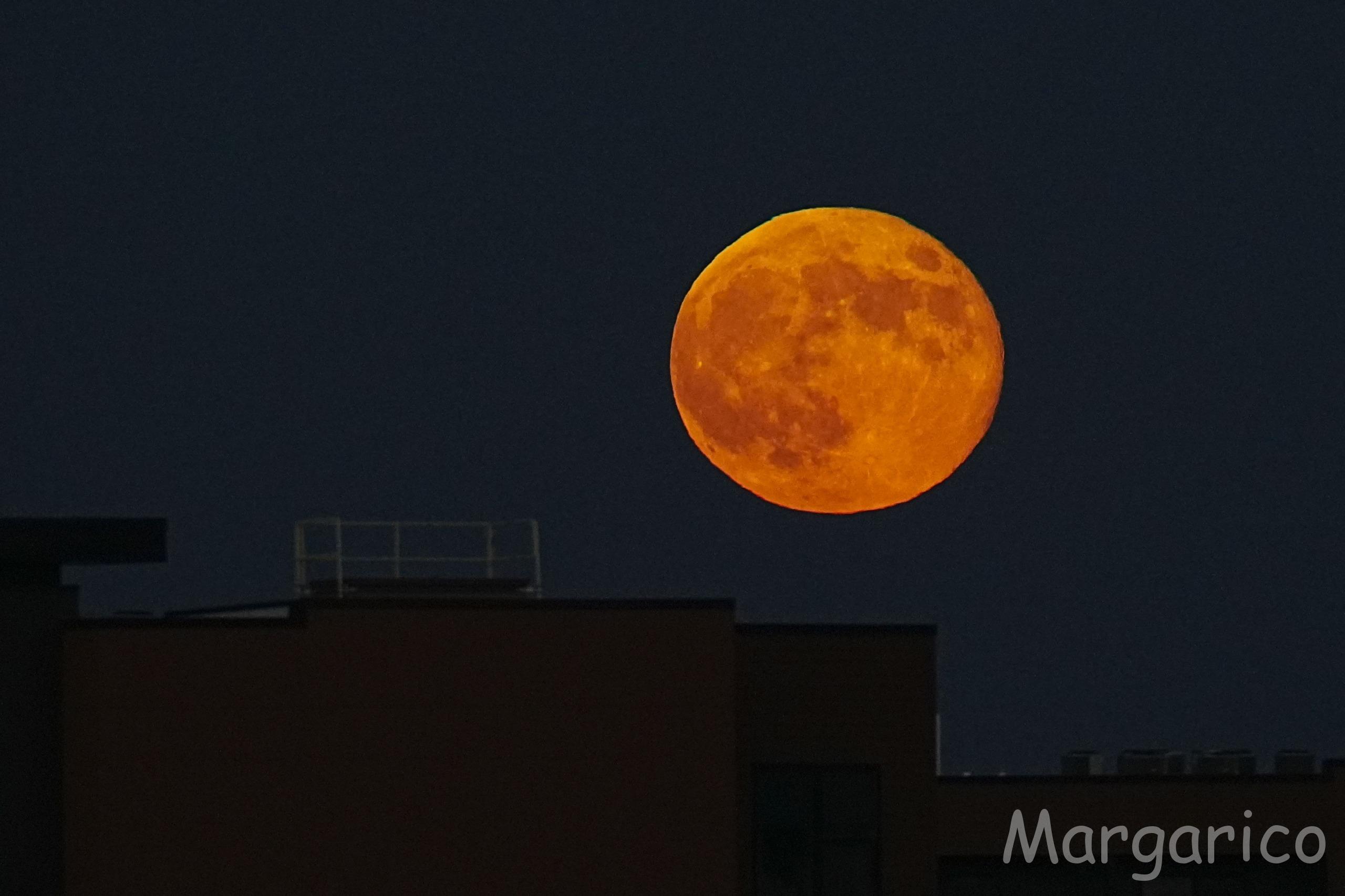 日の入りから8分後の19時6分に東の空に現れた月 ⇩ すごいオレンジ色