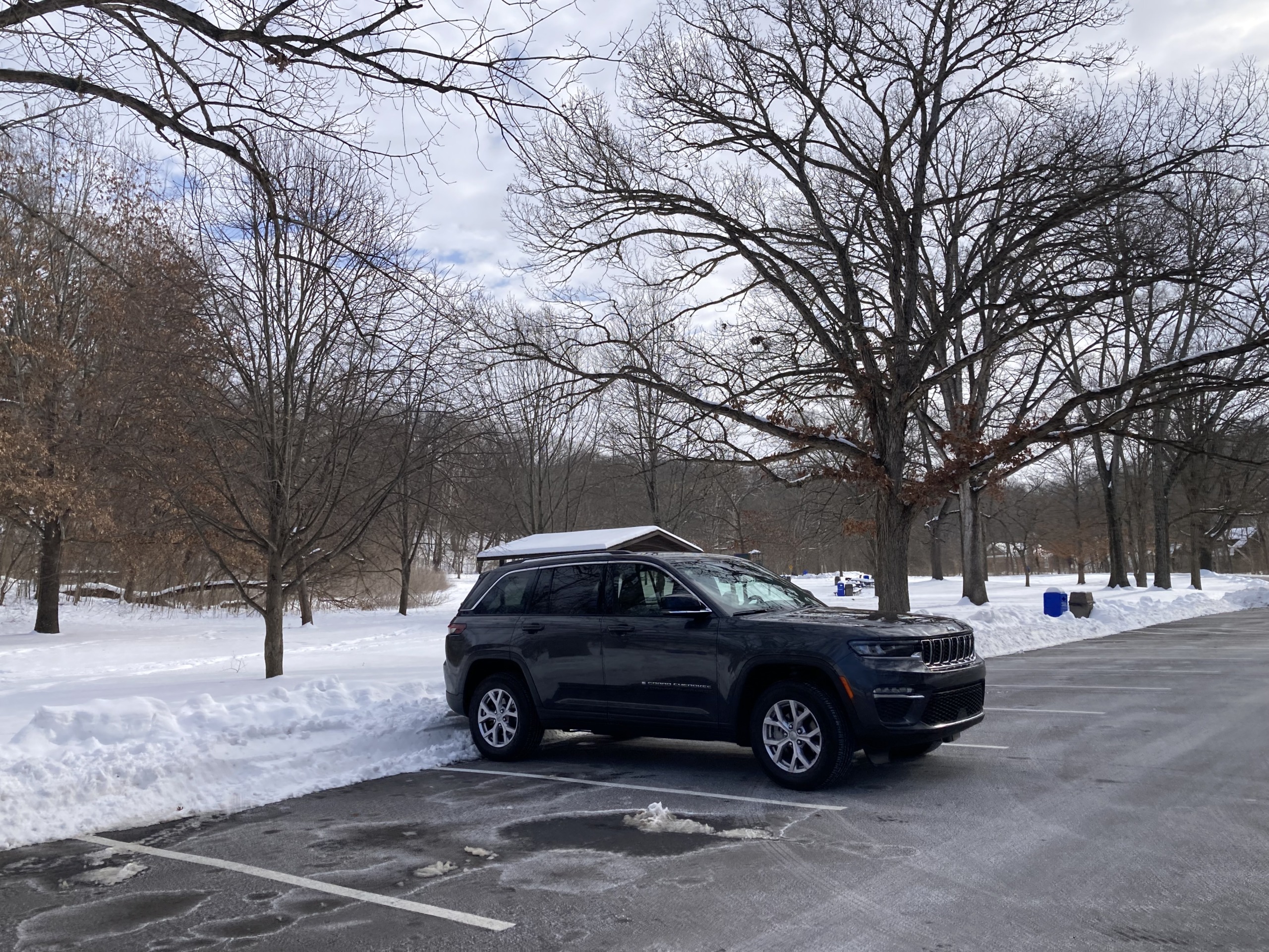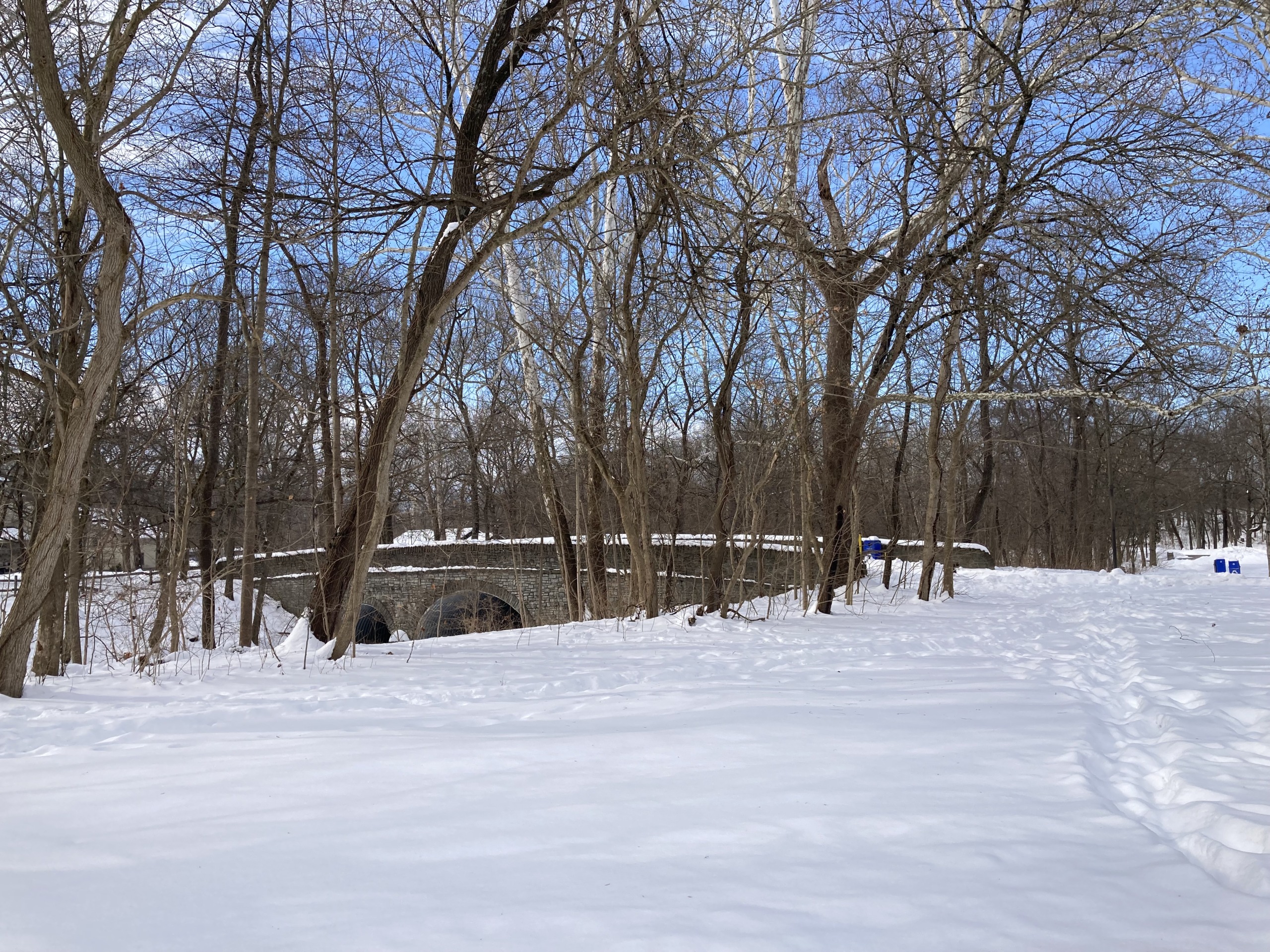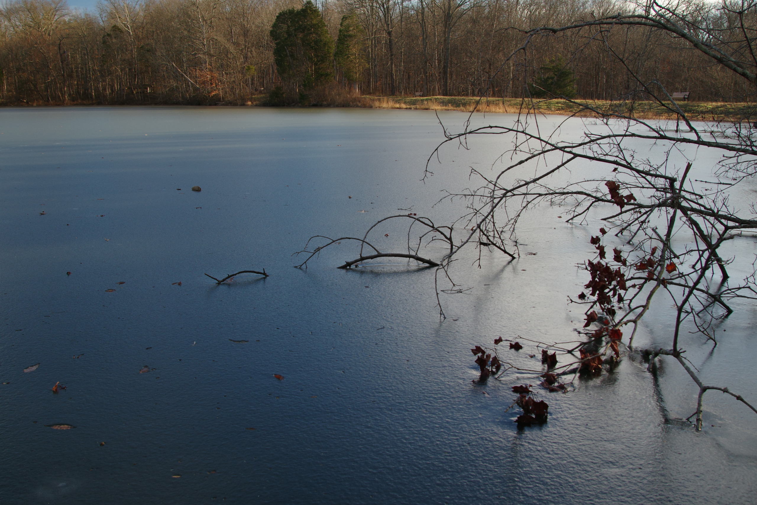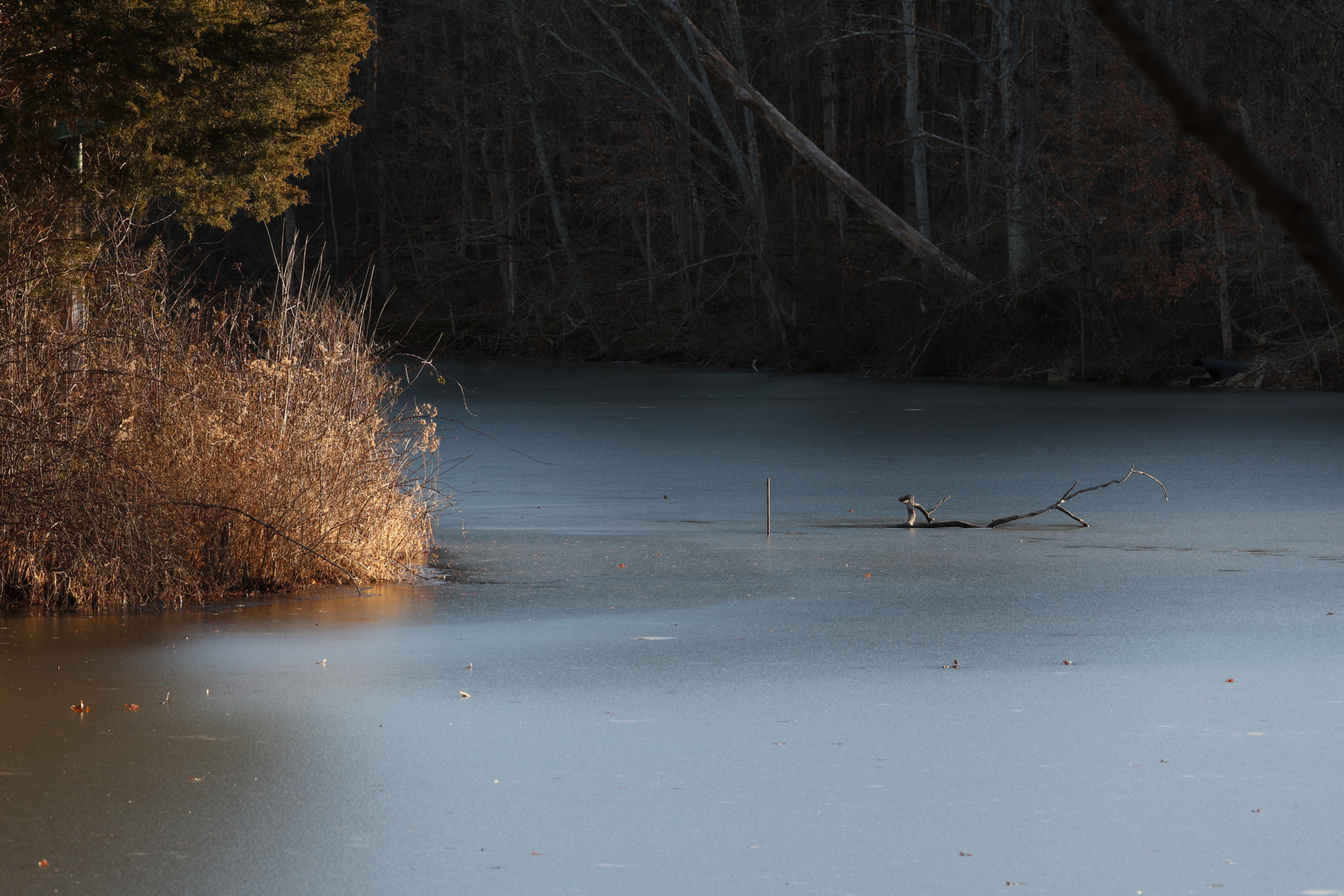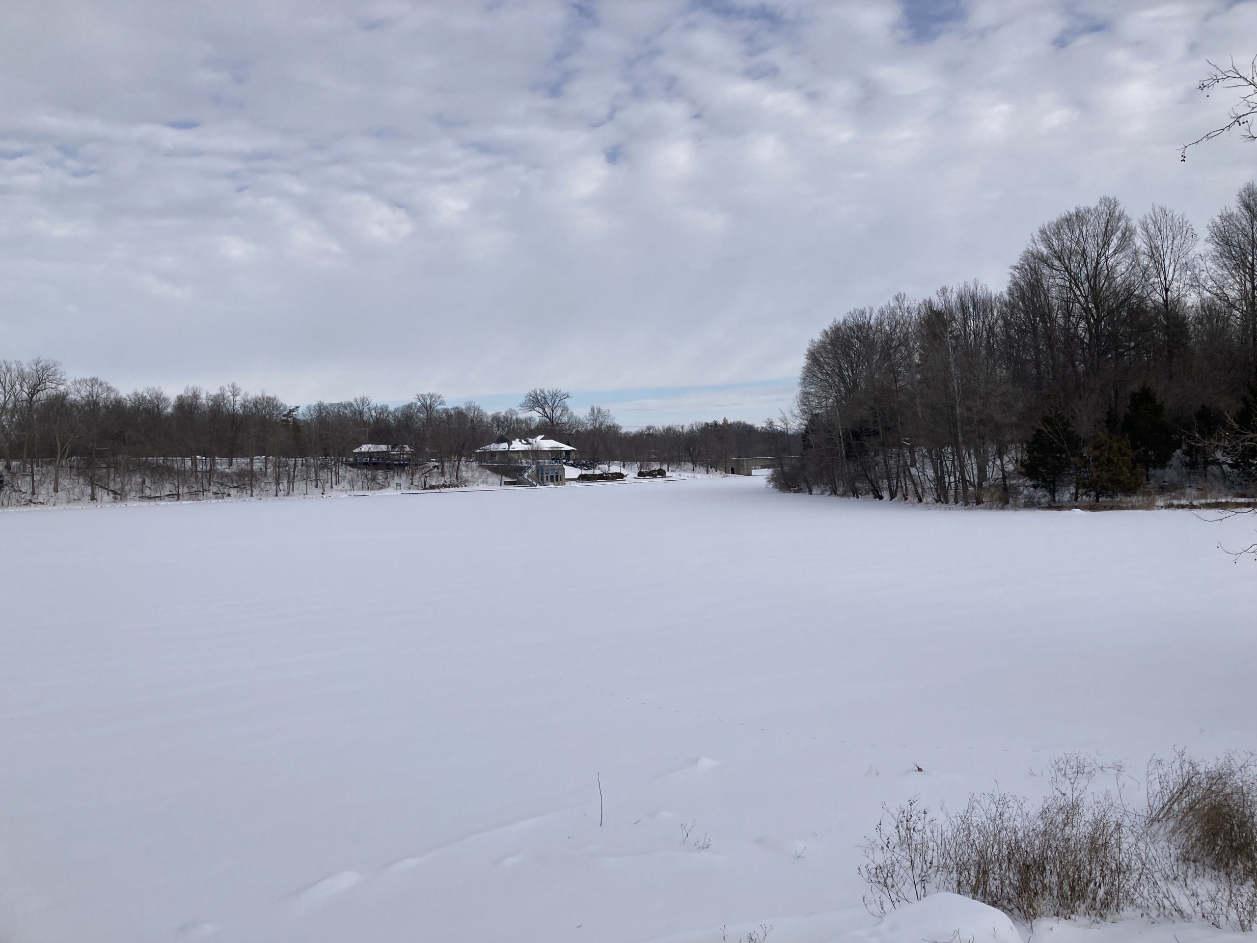 凍って雪が積もっている池 ⇩