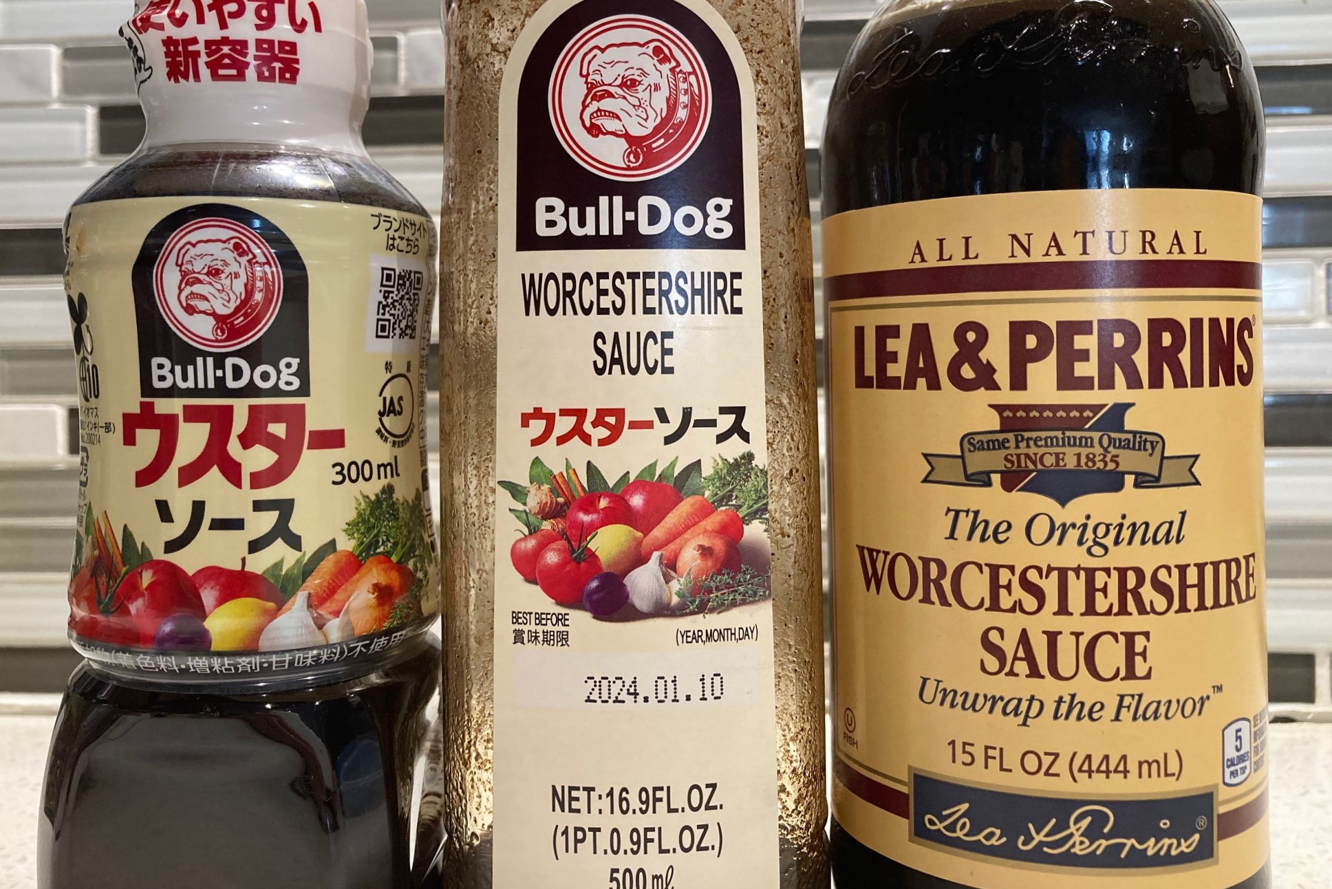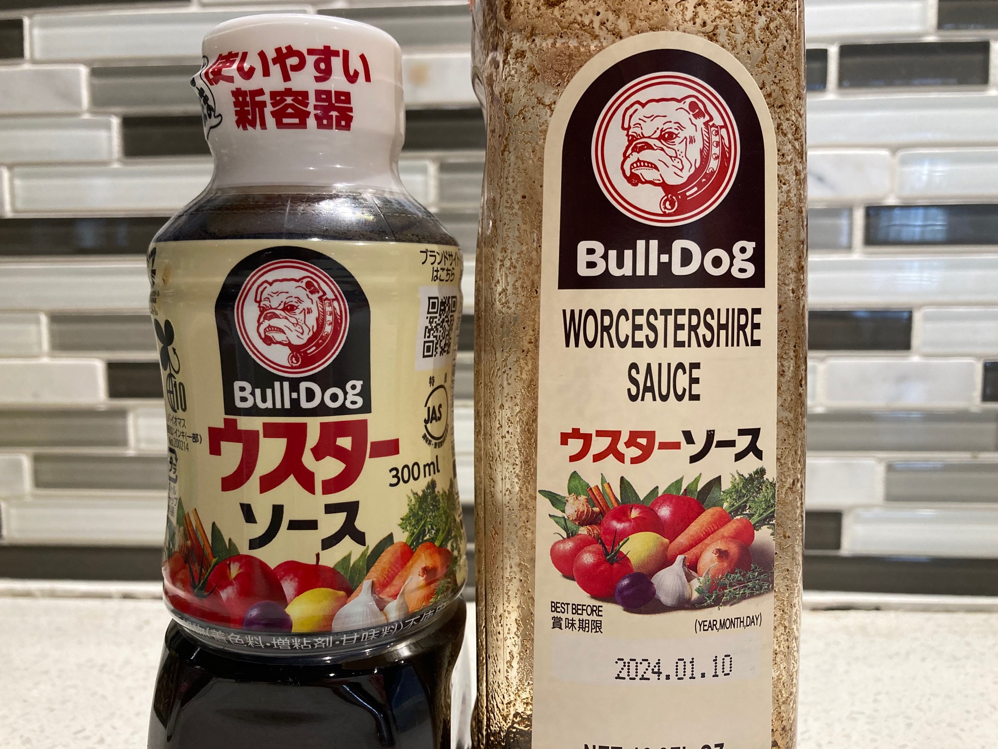 家にあるウスターソースを見てみたら ⇩ 右はアメリカで買ったブルドックのウスターソース