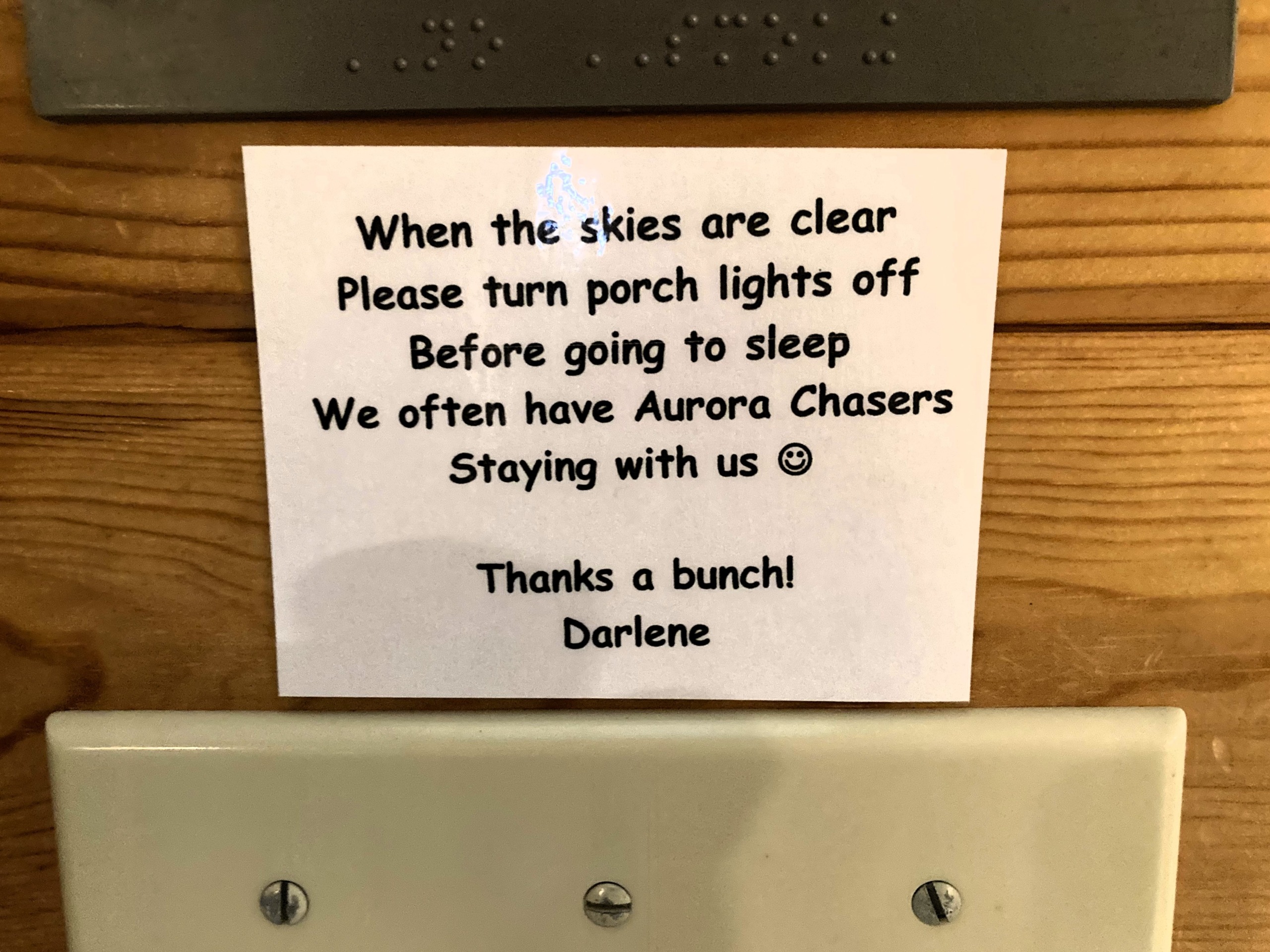 オーロラを見に来る人がいるから外の電気を消して と書いてあった