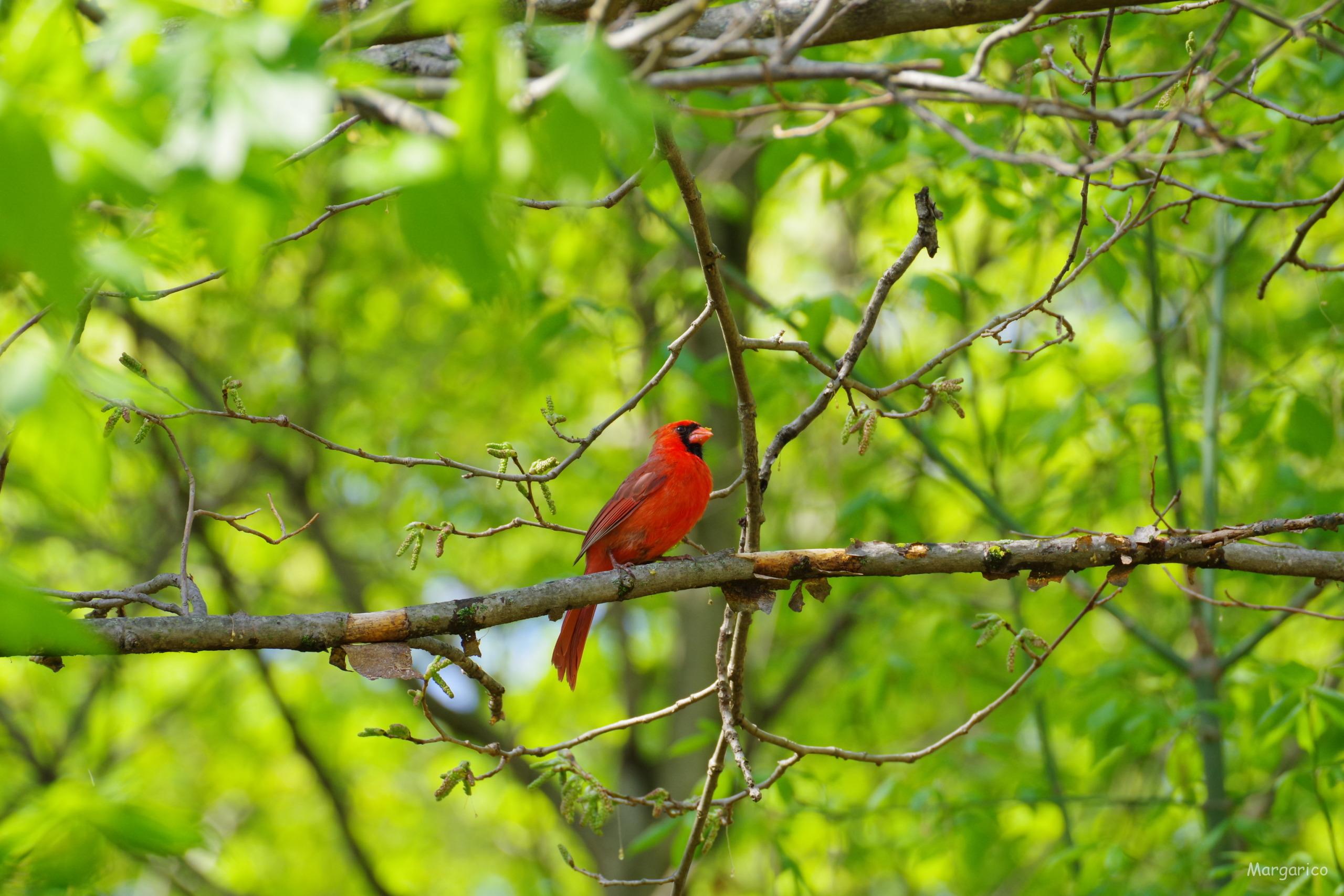 新緑の中でもこの赤い鳥はキレイで目立っている ⇩ カージナル